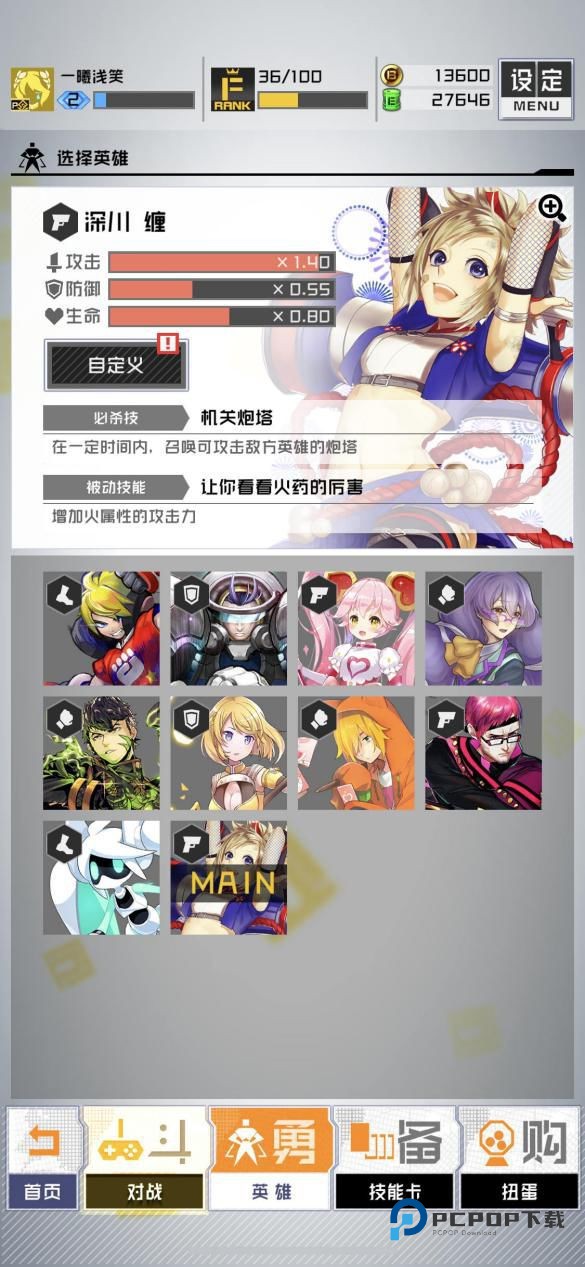 英雄并没有强弱之分,每个英雄拥有自己不同的终极技能,但是搭配其他四种小技能(技能卡)将由玩家随意搭配!