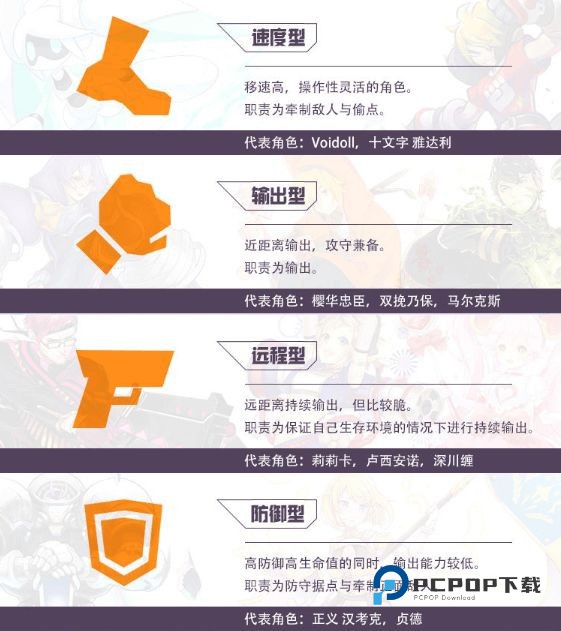 英雄划分四种类型:【速度型】、【输出型】、【远程型】、【防御型】;