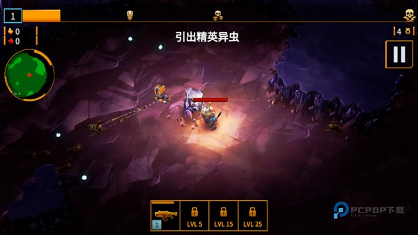 1、游戏采用俯视角自动射击机制,武器能自动瞄准攻击异虫,玩家无需分心瞄准,可专注于操控矮人走位躲避弹幕、挖掘矿物。