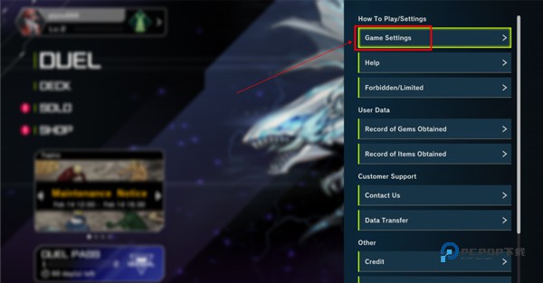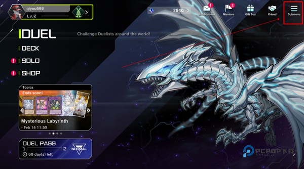 1、打开游戏王大师决斗手机版,进入游戏之后点击右上角Submenu;