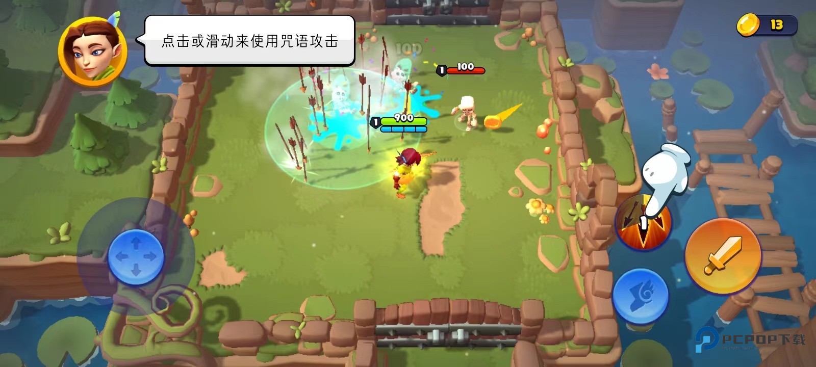 2、左边的按钮控制角色的移动,而右边的按键则是冲刺、攻击,冲刺按钮可以避免任何伤害,而攻击按钮分为武器攻击和咒语攻击;