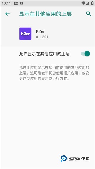 2、开启悬浮窗小部件,让k2er允许显示在其他应用的上层。