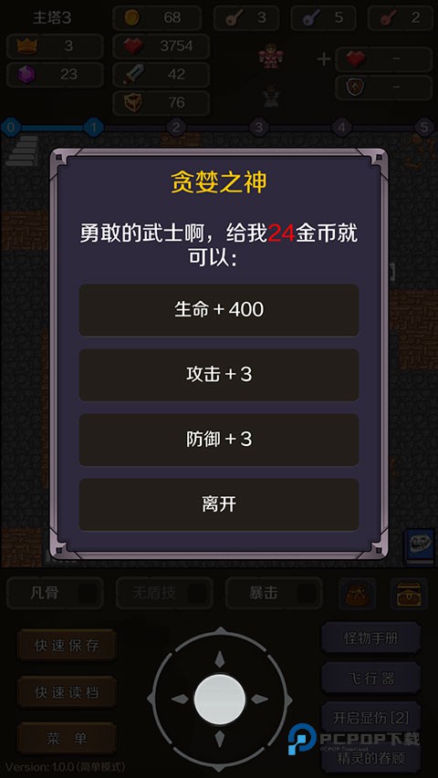 贪婪之神也就是俗称的金币商店,位于主塔3层。消耗金币可以增加生命、攻击或防御,每升级一次,所消耗的金币都会增加。