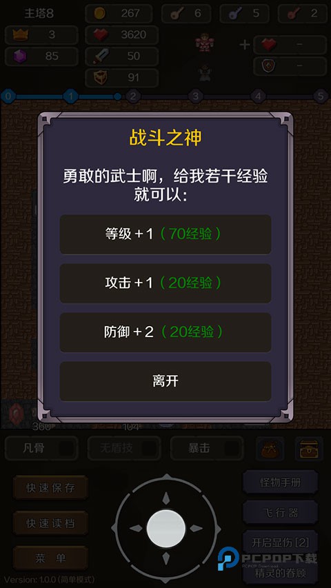 战斗之神也就是俗称的经验商店,位于主塔8层。消灭怪物获得经验,消耗固定经验可以提升主角等级、攻击或防御。