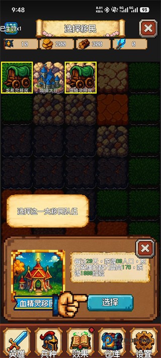 选择“血精灵移民”可带来持续收益:每20天获得80人口、英雄智力+178 与1000经验,能明显提升中后期英雄成长速度。
