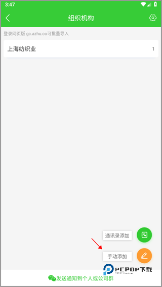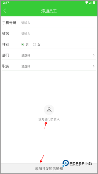 3、以手动添加为例,输入员工的手机号,个人信息以及所在部门等,添加好后点击下方“添加并发短信……”,这样员工就会收到这份短信,你也添加成功了。