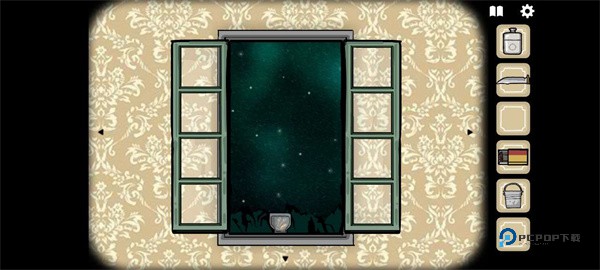 11、转到房门画面,得到下图红框处的桶。黄框处得到的玻璃瓶。绿框处打开后得到火柴。