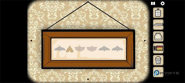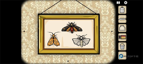 16、前往大门处场景,左边的蝴蝶标本处后放入蝴蝶。然后依照提示顺序进行放入,顺序的提示在之前三个瓶子装水的玻璃柜上面有。完成后上面的蝴蝶腹部会被割开,拿到种子。