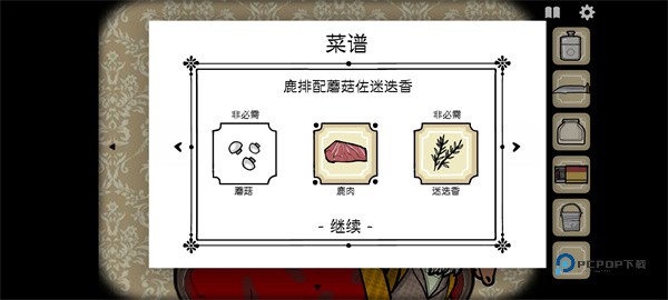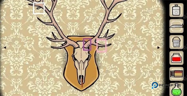 鹿先生右上角绿框鹿头装饰放大后,先点击紫框,点到不能点了,再点击粉框,左边也会长出来,在白框处点击后长出植物,得到迷迭香。继续点击粉框,骷髅下面会滴出红色液体,用玻璃瓶装好得到塔巴斯科辣椒酱。