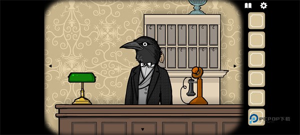 22、首先乌鸦先生前台这里,背后的钥匙存放处房间1的钥匙出现了,拿走。