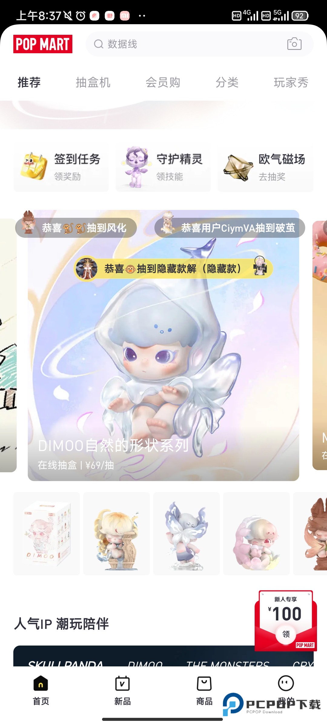 1、打开软件首页,点击“商品”或“新品”栏目,选择喜欢的系列(如SKULLPANDA、DIMOO等)。