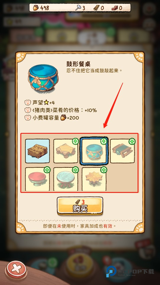3、找到可以购买并升级的餐桌如“鼓形餐桌”,并点击购买