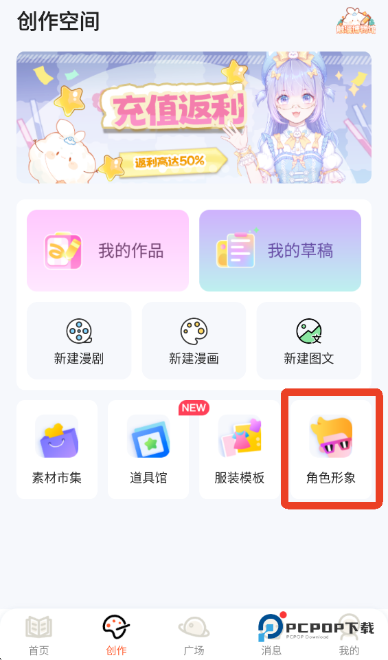 1、首先点击【创作】-【角色形象】,进入之后点击【公用角色】。