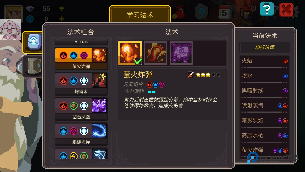 2、游戏总共为我们提供6种元素,我们可以将其中3种组合组合起来形成新的法术,用来对付敌人。
