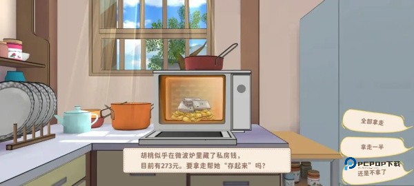 钞票,小猪存钱罐(在电视机右边柜子上)会一直涨钱,有上限,记得及时领取,胡桃会在微波炉藏钱,你可以偷拿