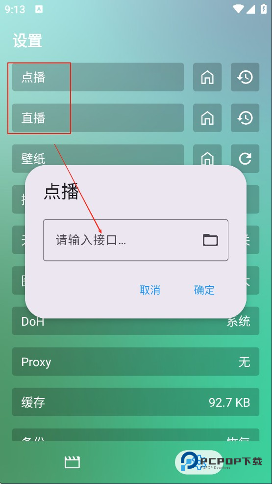 2、点击“点播”或者“直播”,然后自己填入下面的任意接口配置地址