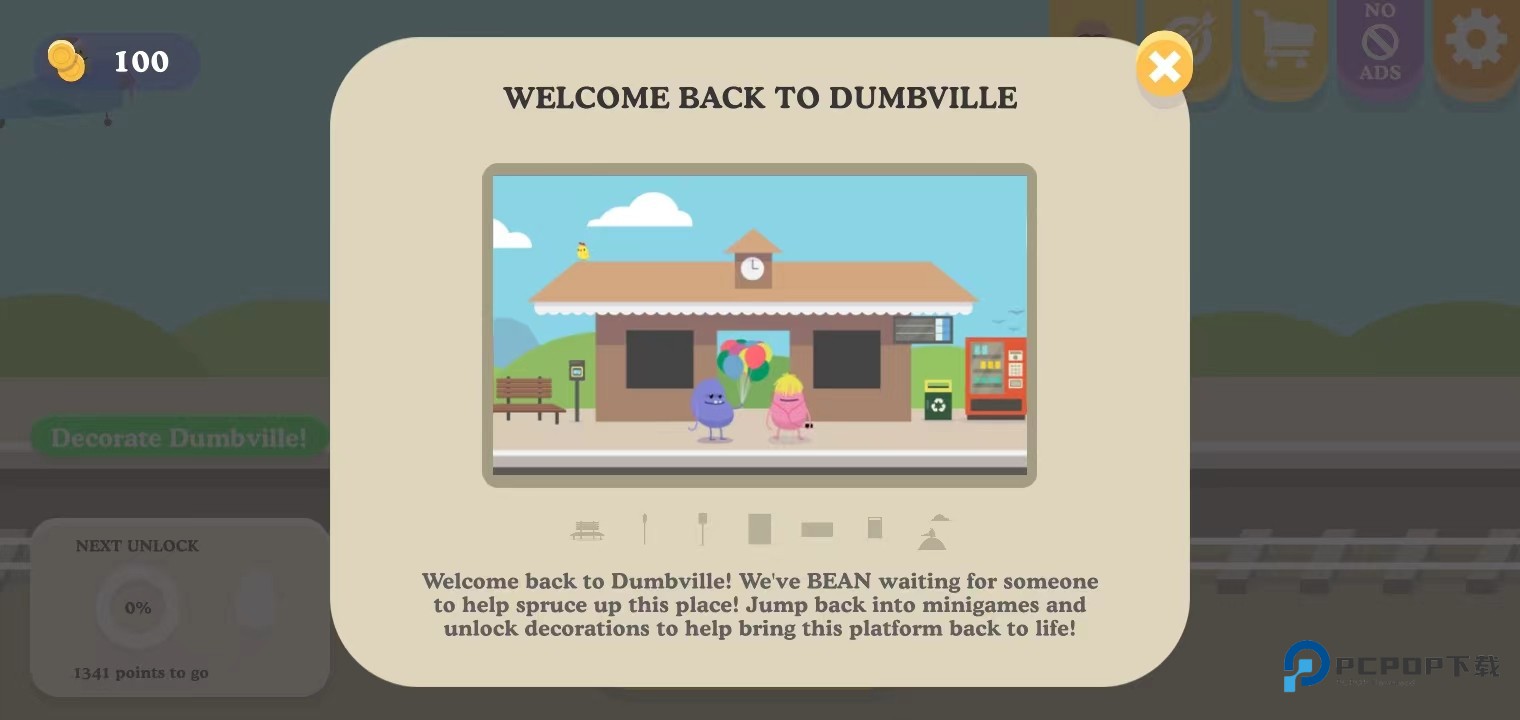 2、点击关闭;(欢迎回到邓布维尔!我们一直在等着有人来帮我们美化这个地方!跳回迷你游戏并解锁装饰,帮助这个平台恢复活力!)
