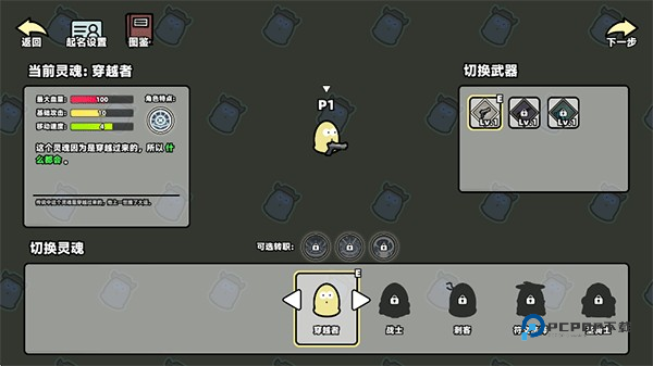 3、进入游戏选择界面,左上角起名设置可以进入更改游戏昵称,右侧切换武器,下方切换灵魂(新手待解锁),点击图鉴;