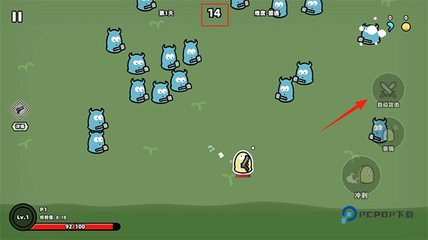8、进入游戏操作页面,开启右侧的自动攻击模式,自动射击靠近的敌人,坚持到上方的时间倒计时结束即可胜利;