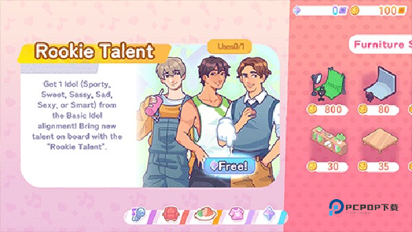 3、进到页面后,点击“free”雇佣第一位实习练习生,你作为他的新经理,需要帮助他发光发亮。