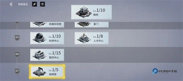 舰船上阵位随母舰建设中的指挥部等级提高而解锁。