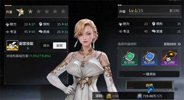 点击右上角的加号图标,可对船员进行升级或升星以提高船员属性。升级需要消耗作战数据。作战数据分为三种品质,品质越高,使用时给船员增加的经验值越多。所有船员初始星级一致,可以通过升星系统提升至最大星级。