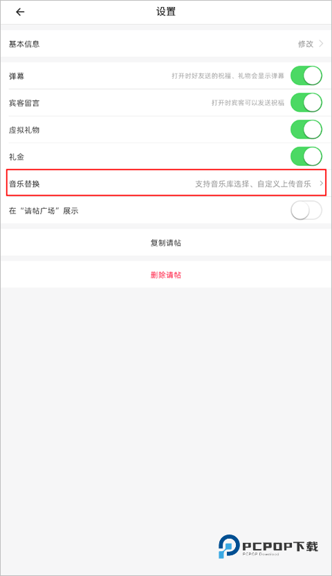 2、接着在设置界面选择“音乐替换”即可在音乐库自行选择音乐。