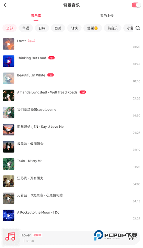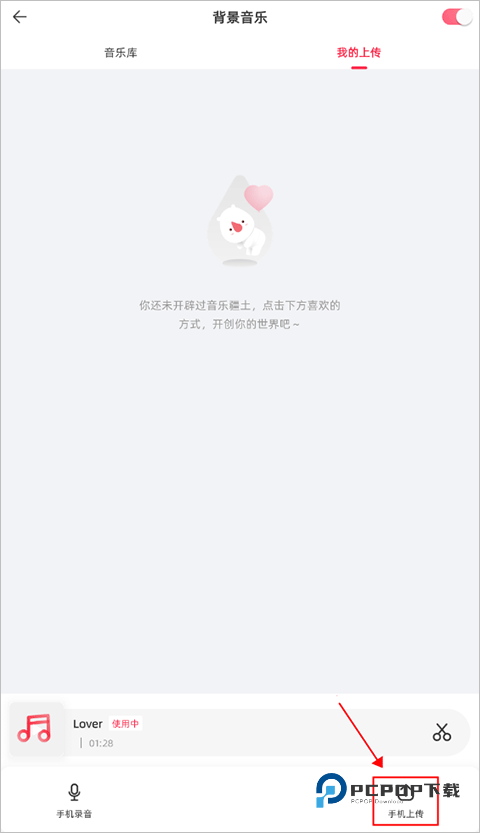 3、在背景音乐界面点击“我的上传”可点击下方的“手机上传”即可导入自己喜欢的音乐。
