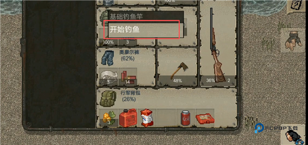 2、有黑影晃动时,打开背包点击使用钓鱼杆开始钓鱼(用白醋木棍、绳子可制作钓鱼竿)。