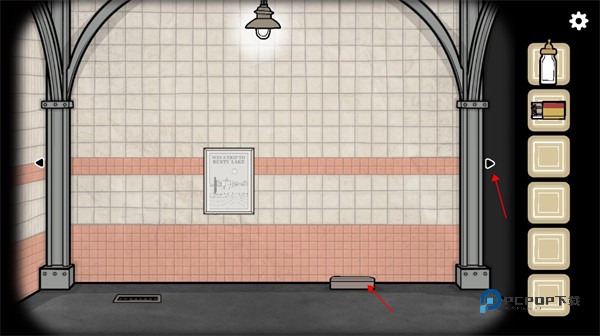 11、然后我们去到垃圾桶旁边的售票处,用钥匙开门,用水管敲击门框,叫醒售票员然后和她互动,提示我们需要一枚硬币。