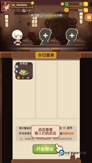 4、进入营业界面后,选择今日菜单、配置厨师,点击【开始营业】即可让餐厅自动运营,获取收益与加速道具。