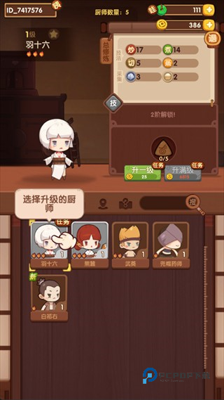 7、在厨师界面选择厨师,消耗金币升级可提升其厨艺属性,让菜品制作更快、收益更高。