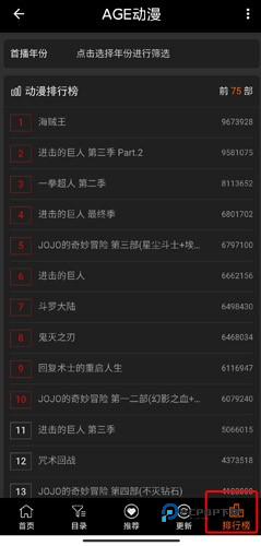 5、排行榜页面、会将每一年的前75部动漫进行排列。