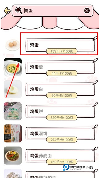 3、在查询结果页面,选择你刚刚输入的食物选项,即“鸡蛋”;