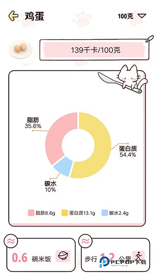 4、进入“鸡蛋”页面后,你就可以查看到该食物的热量以及需要消耗多少热量的运动数值了。