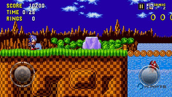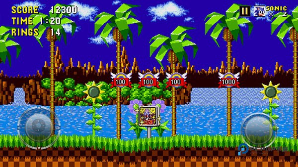 1、游戏百分百移植街机玩法,玩家需要操控我们的索尼克进行一路的冒险闯关。