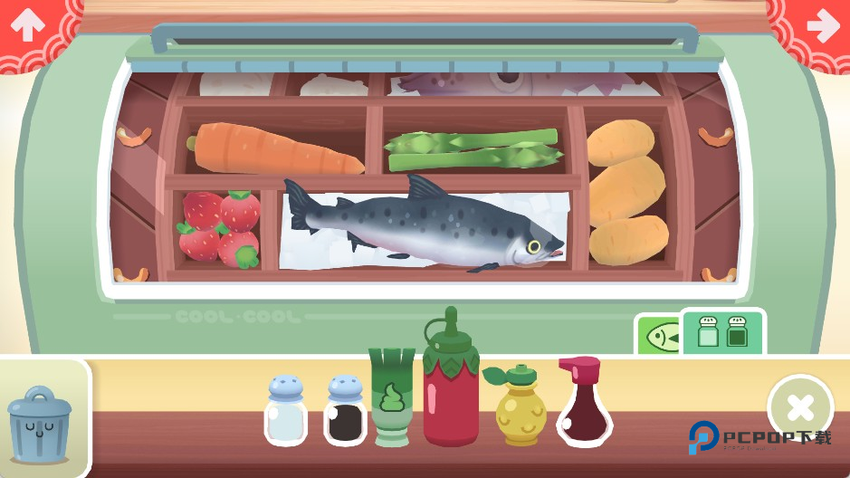 3、打开食材栏,从冰箱或备料区取出订单所需的原料(如鱼片、鳄梨、米饭等),按清单准备好。