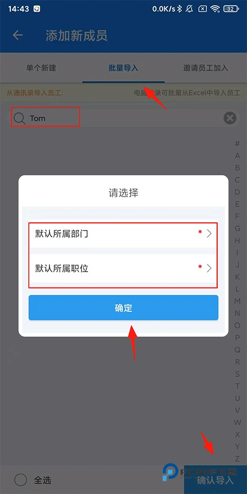 3、选择【批量导入】-搜索栏搜索相关客户信息-选择【默认所属部门/职位】-点击【确认】-【确认导入】即可。