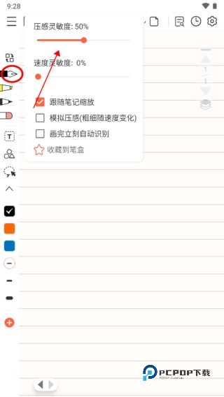 5、点击左侧提供的笔,点击可调整灵敏度等