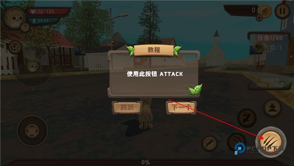 5、这是游戏开始的界面,左侧下面的方向键可以控制猫咪的走动,右侧五个按钮作用各不相同,最大的按钮可以攻击杀死老鼠的,围着的三个按钮是技能,大家可以自己摸索,还有一个“猫咪向前跳跃”的按钮,可以使猫咪向前跳跃。