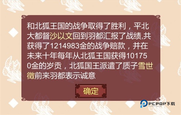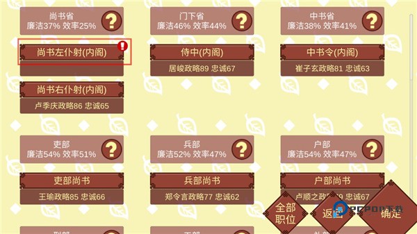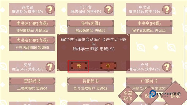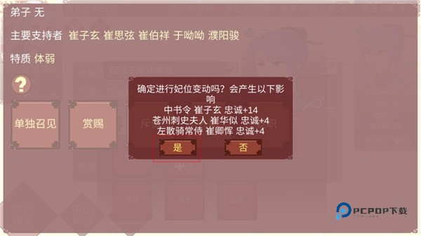 18、确定进行妃位变动吗?会产生以下影响中书令崔子玄忠诚+14乐苍州刺史夫人崔华似忠诚+4 g左散骑常侍崔卿恽忠诚+4,点击是;