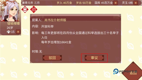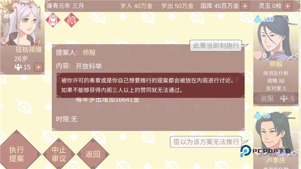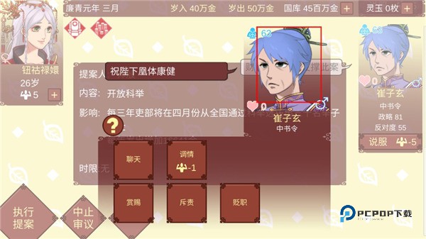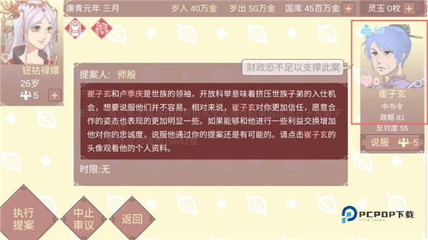 12、崔子玄和卢季庆是世族的领袖,开放科举意味着挤压世族子弟的入仕机会,想要说服他们并不容易。相对来说,崔子玄对你更加信任,愿意合作的姿态也表现的更加明显一些。如果能够和他进行一些利益交换增加他对你的忠诚度,说服他通过你的提案还是有可能的。请点击崔子玄的头像观看他的个人资料。