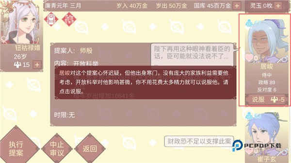 11、居峻对这个提案心怀迟疑,但他出身寒门,没有庞大的家族利益需要他考虑,开放科举对他影响甚微,你不用花费太多精力就可以说服他。请点击说服。