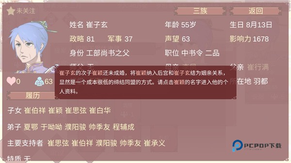 14、这里可以看到崔子玄的次子崔颖还未成婚,将崔颖纳入后宫和崔子玄结为姻亲关系,显然是一个成本很低的缔结同盟的方式。请点击崔颖的名字进入他的个人资料。