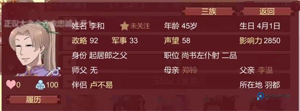 然而并不是100忠诚就代表着能重用,得对臣子的三族、支持者、以及政略做一个大致的评定。