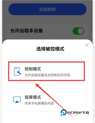 点击“允许远程本设备”右侧的开关,这时底部会弹出“选择被控模式”弹窗(如下图)。
