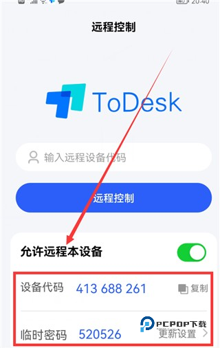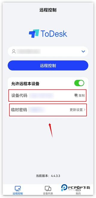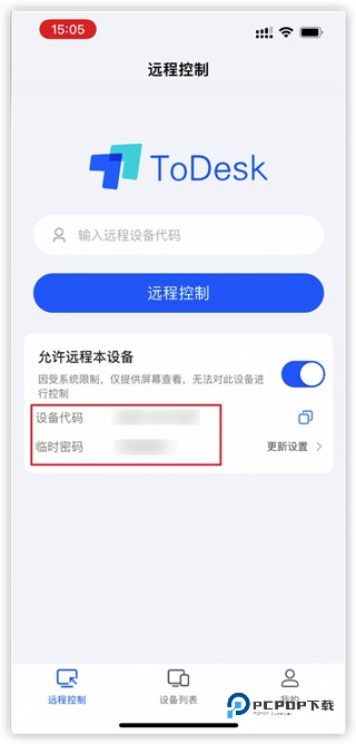 然后返回到todesk的首页,这时会显示“设备代码和临时密码”(如下图),这个在我们远程控制时会用到。