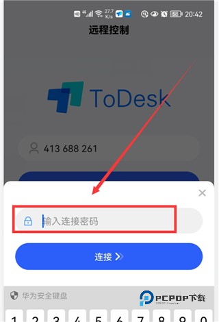 在输入框中输入“远程设备代码”,也就是另一部手机的代码。然后点击“远程控制”按钮,这时会弹出一个弹窗,需要我们输入“连接密码”,也就是另一部手机todesk首页显示的“临时密码”。