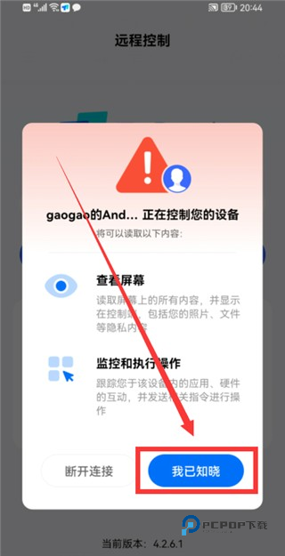 输入好密码后,点击“连接”,这时,另一部手机上会弹出“XXX正在控制你的设备”的界面(如下图)。
