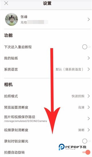 2、进入到无他相机设置页面后,可以看到有很多的分类设置选项,我们此时向下滑动页面。